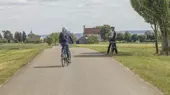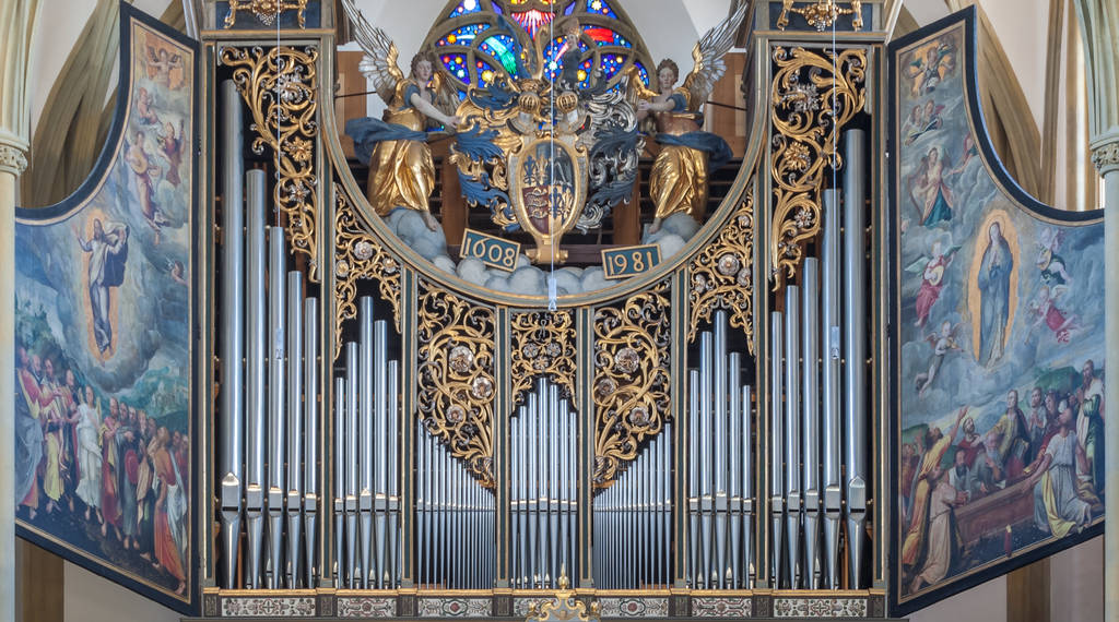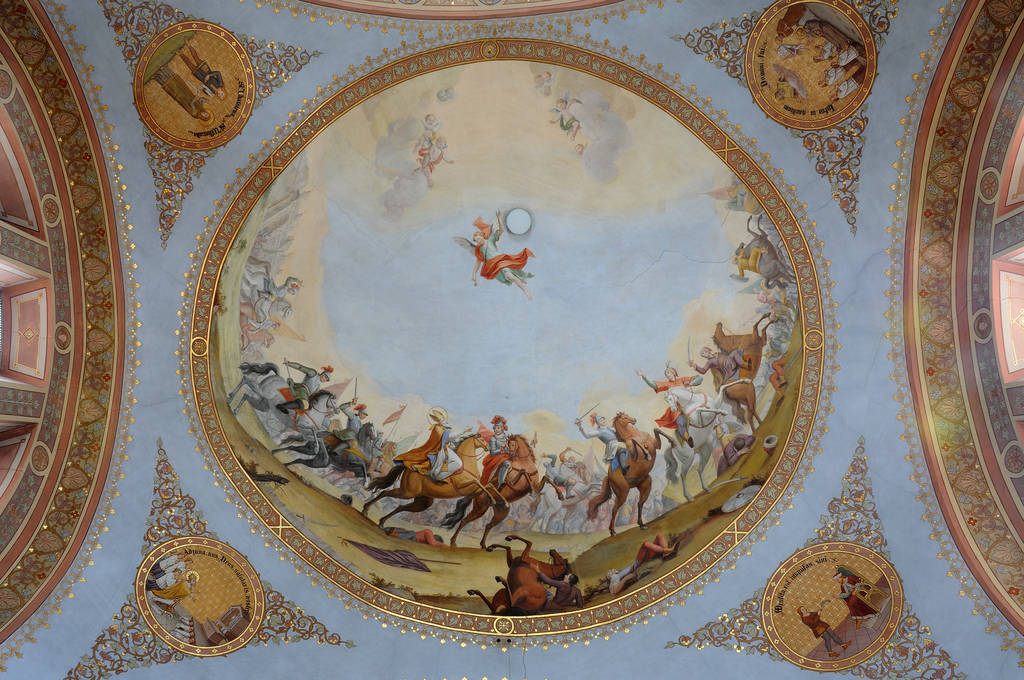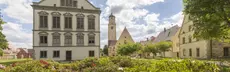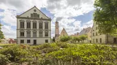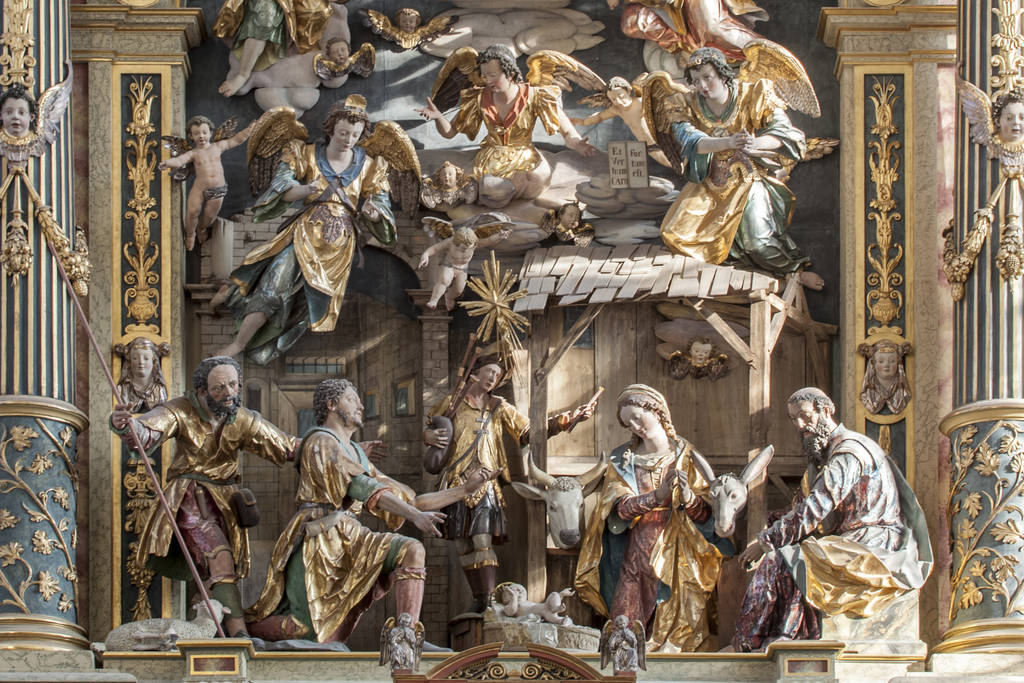 Wir sind erst ein paar Kilometer gemütlich aus der Stadt herausgefahren, als bei einem Bauernhof ein Storch vor die Fotolinse stolziert. Als wir absteigen, kommt die Bäuerin heraus und berichtet: „Der Storch hat in der Nähe sein Nest. Bei uns sind es dieses Jahr zwei Nester.“ In Oettingen sei es mit den Störchen fast schon eine Plage, erklärt sie. Wir erfahren noch einiges über die Tiere. Nach weiteren elf Kilometern, vorbei an Wiesen voller Margeriten und an einer imposanten Kapelle mit einer großen Kreuzigungsgruppe gleich neben dem Radweg, legen wir in der besagten Stadt eine erste Rast ein. Über den farbigen, geschwungenen Giebeln sehen wir viele der schwarz-weiß gefiederten Vögel in ihren Nestern sitzen. In der Nähe des Rathauses nehmen wir an einem Café-Tisch Platz und bestellen Espresso. Der tut gut und verleiht neue Kräfte. Ein Tourbegleiter ist mit den Kräften leider schon am Ende: Der Akku meines Handys zeigt nur noch drei Prozent an. Ich schalte die App aus. So schnell also müssen wir auf den digitalen Führer verzichten! Gut, dass ich die Tourenbeschreibung auf Papier mitgenommen habe. Sie genügt, stellen wir fest. Wir finden uns gut zurecht. Auch die Besonderheiten der Kirchen sind darin prima erklärt.
