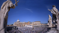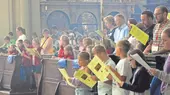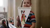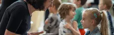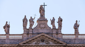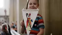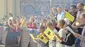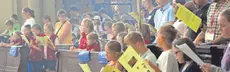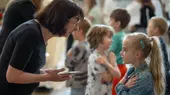 Nach Abschluss der Probe wuselten die Kinder mit ihren Begleitpersonen gruppenweise durchs Kirchenschiff geführt. Die meisten von ihnen waren mit einheitlichen Chor-T-Shirts oder bunten Schals ausgestattet, um sich gegenseitig gut erkennen zu können. Viele nutzten die Möglichkeit, sich in der Basilika etwas umzusehen.